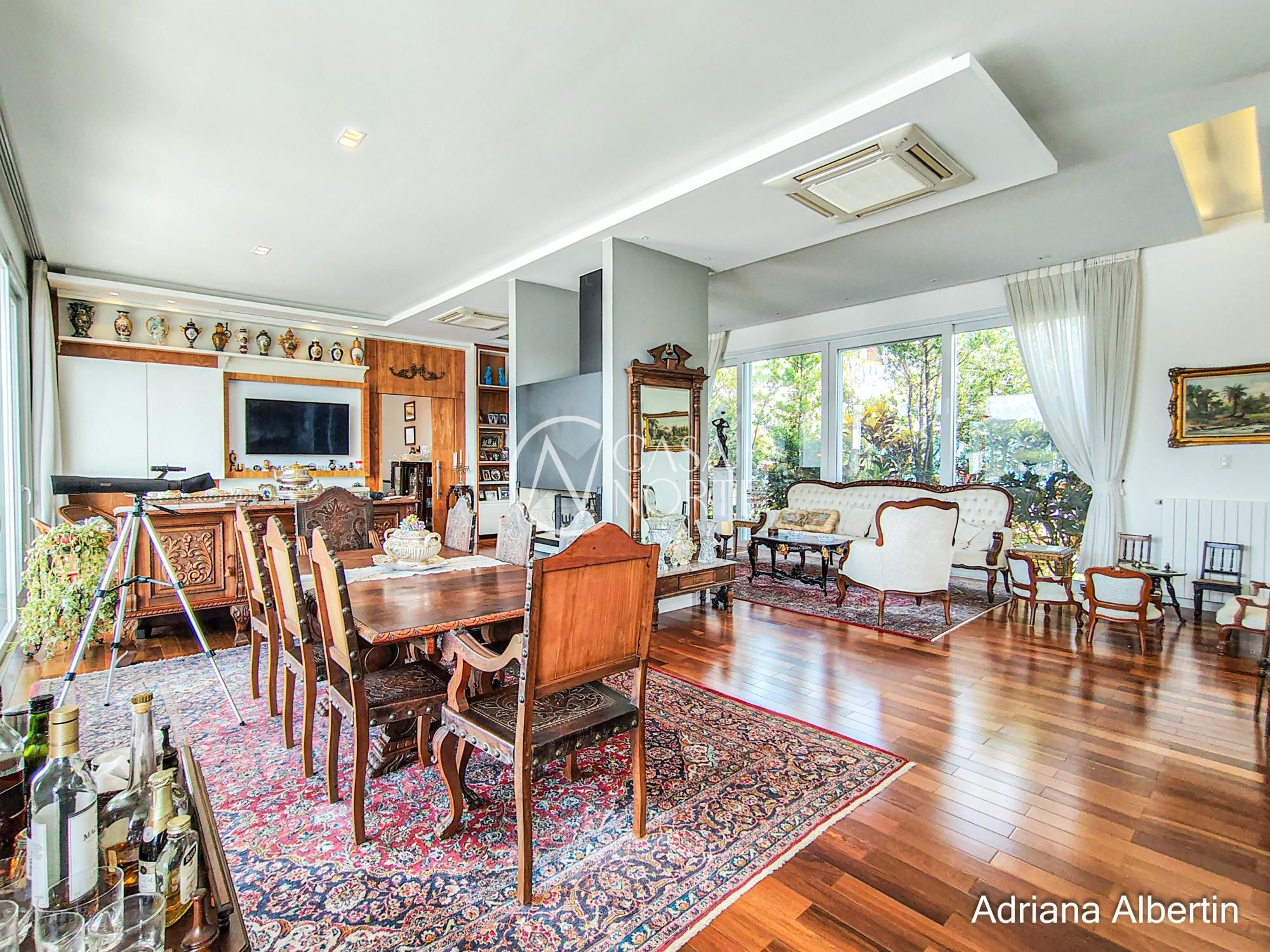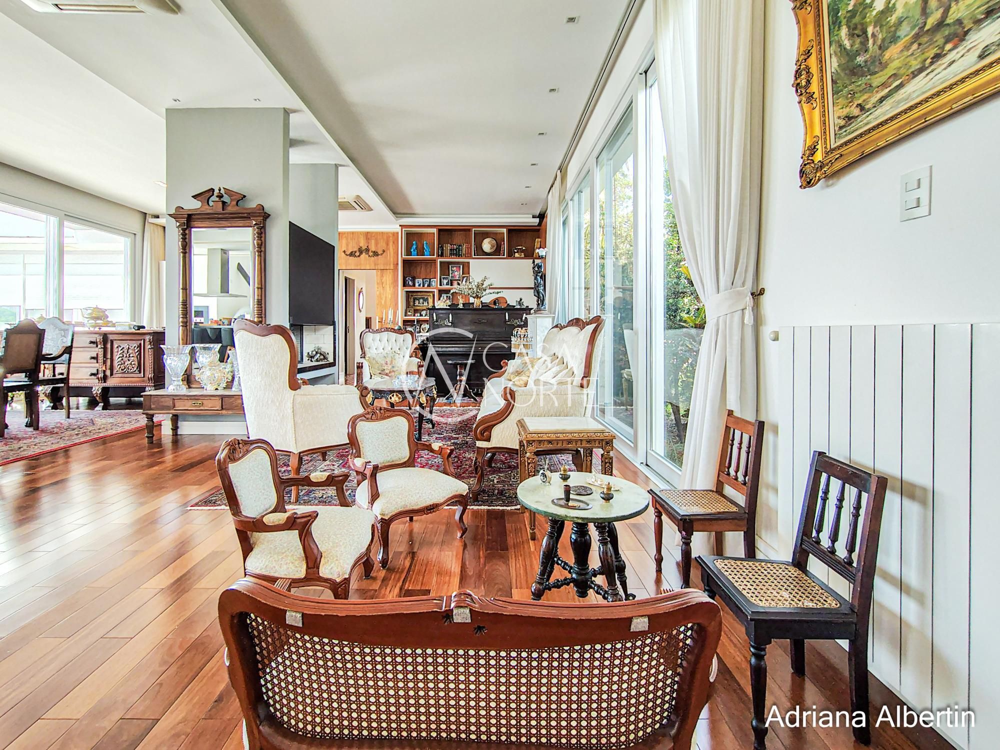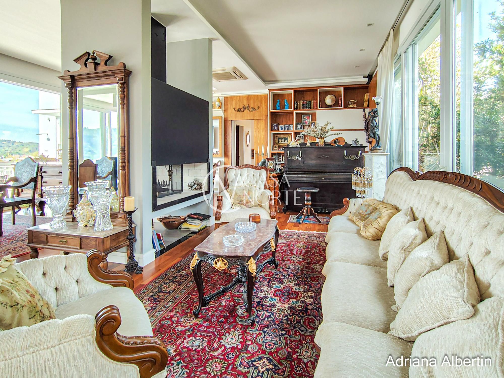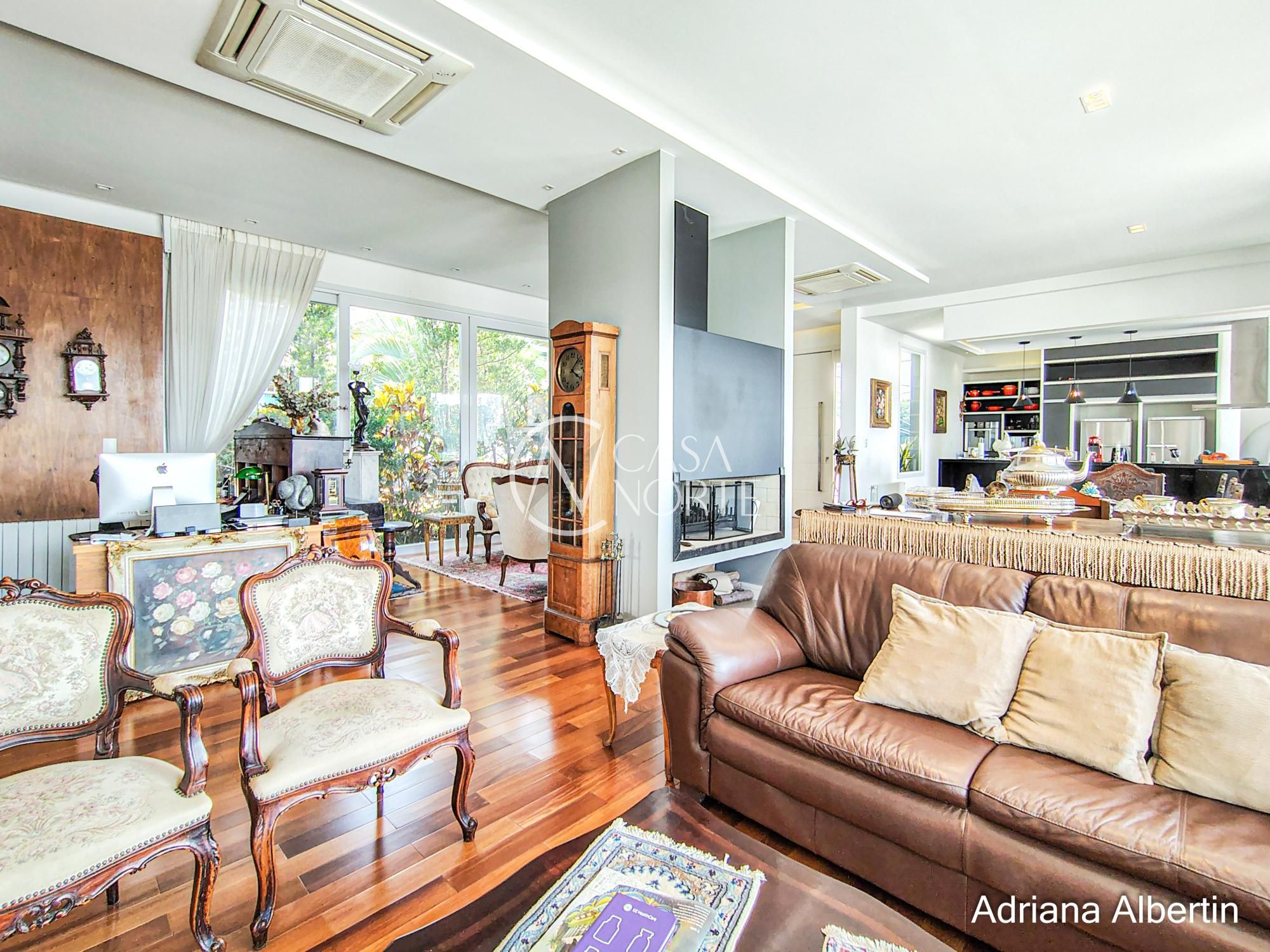 A sala principal traz um contraste interessante: elementos clássicos, mobiliário com presença e lareira como ponto central. Uma casa com história, não um projeto frio.