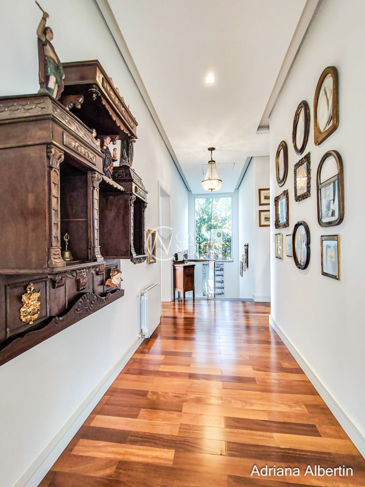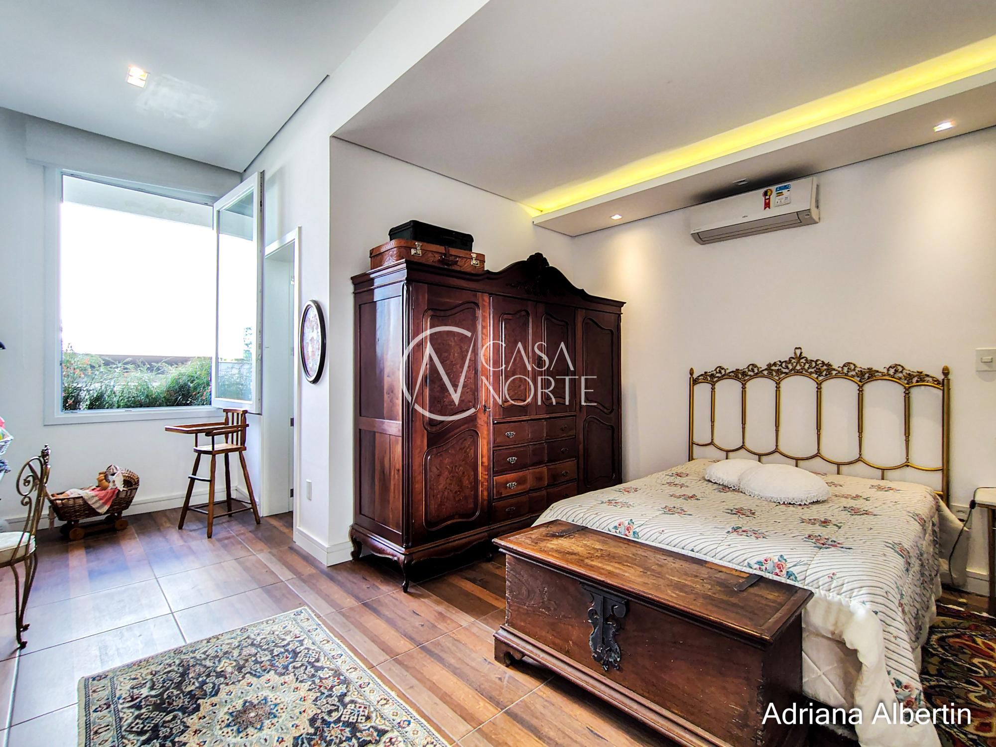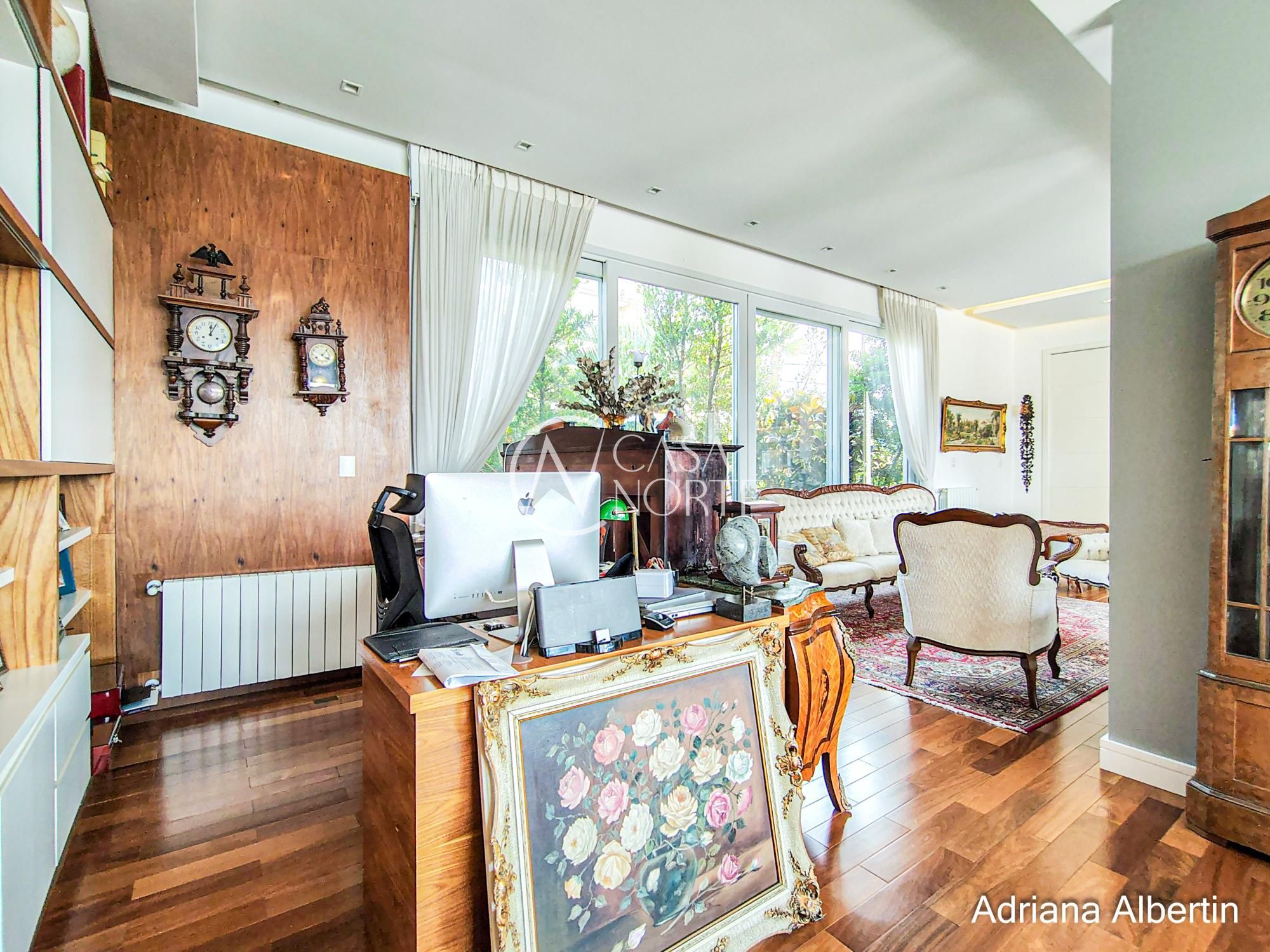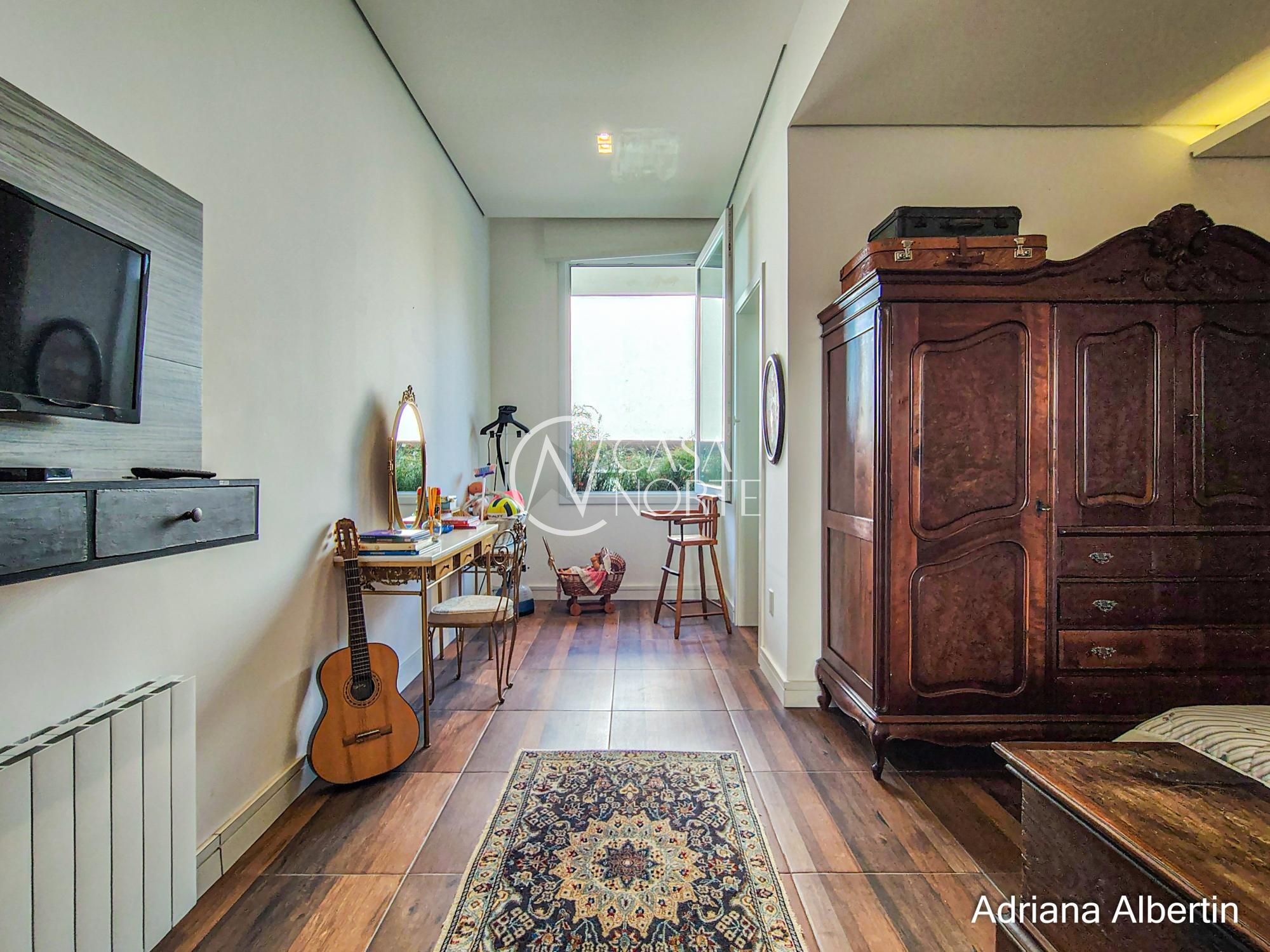 A sala principal traz um contraste interessante: elementos clássicos, mobiliário com presença e lareira como ponto central. Uma casa com história, não um projeto frio.