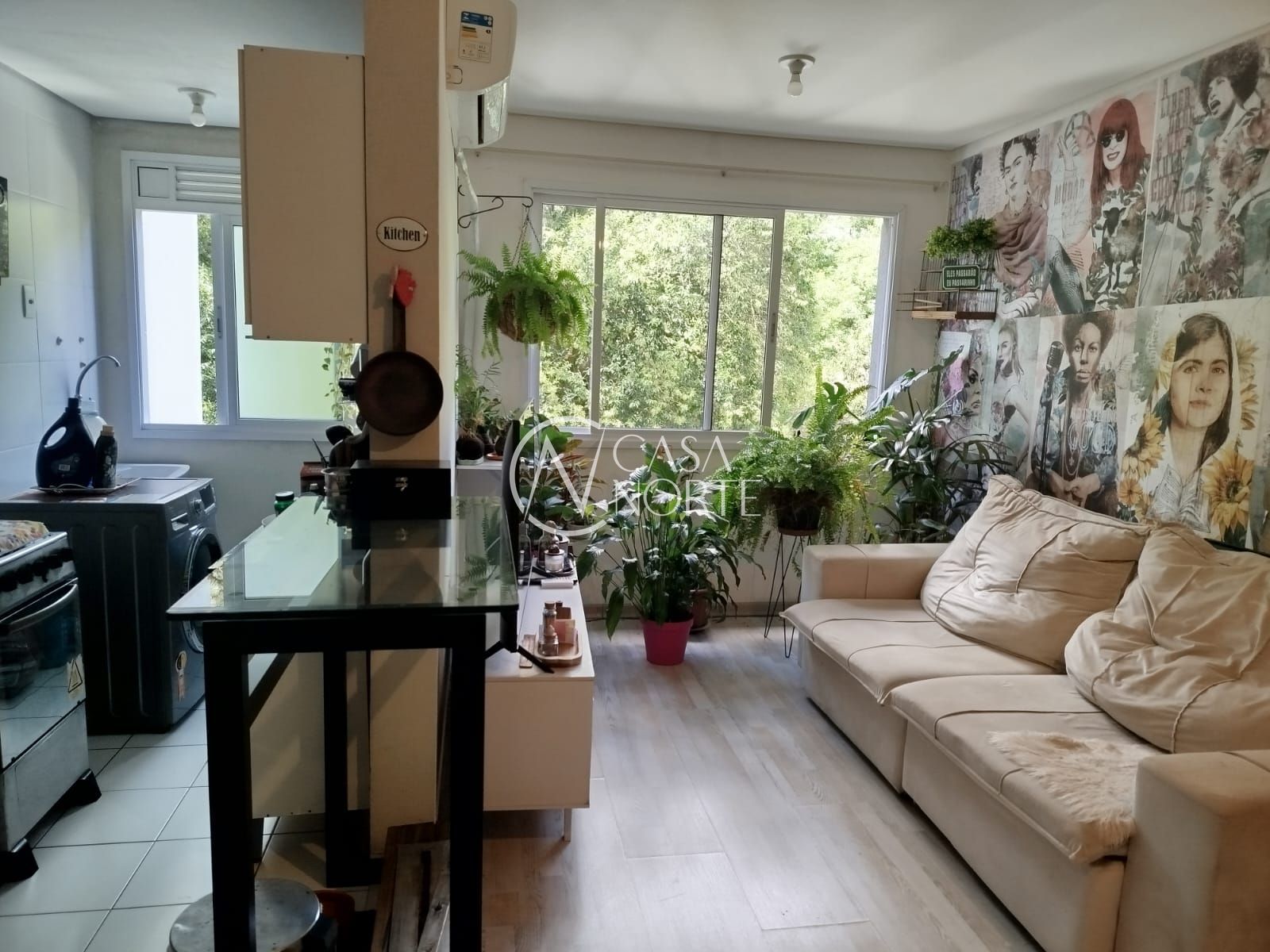 Apartamento semi mobiliado com ampla sala para dois ambientes, cozinha americana, geladeira e fogão, 2 dormitórios sendo 1 suíte.