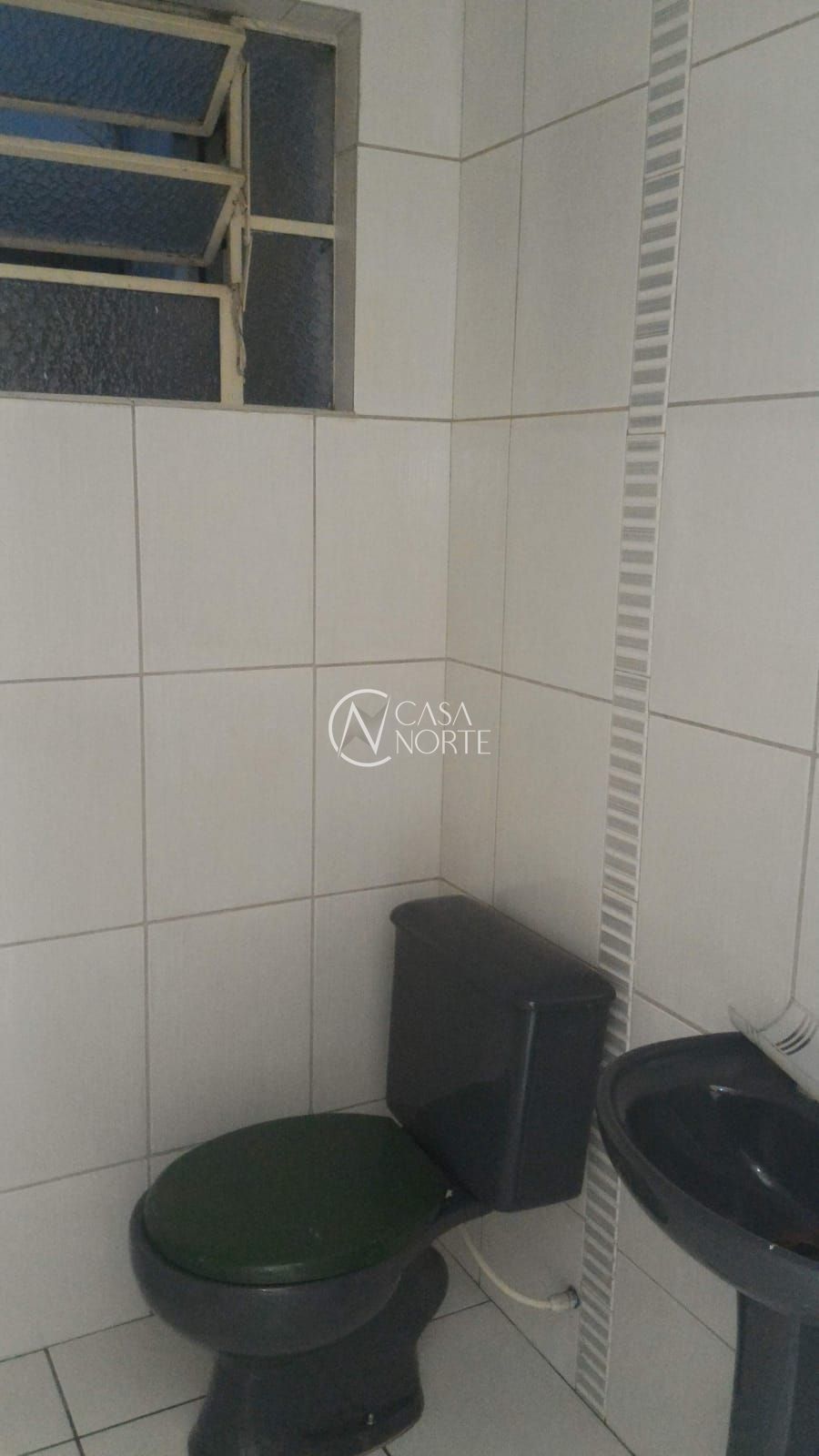 O banheiro social é totalmente revestido em cerâmica, possui box de vidro, armários planejados e janela com abertura para o exterior.