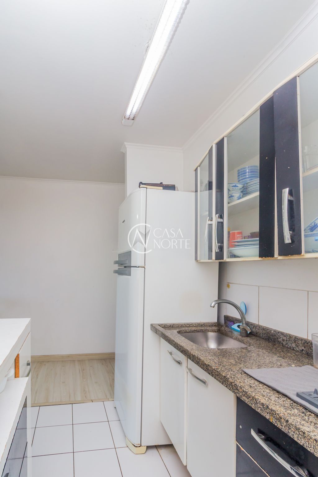 Sala em 2 ambientes conectada com a sacada aberta, cozinha no estilo americana com área de serviço, 2 quartos com privacidade e banheiro com ventilação natural.